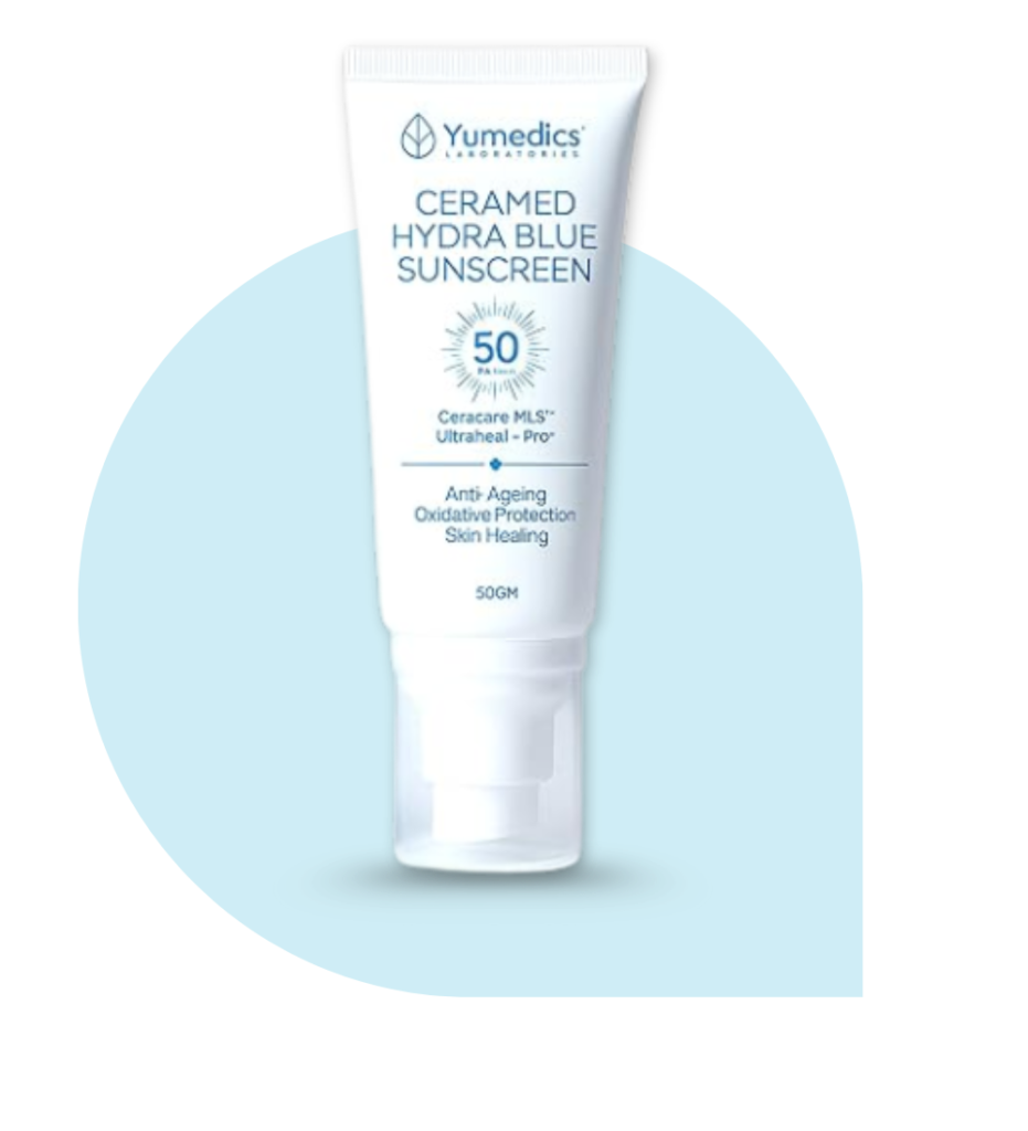 Ceramed Hydra Blue Sunscreen — a broad-spectrum SPF 50 PA++++ sunscreen that protects from UVA/UVB damage while hydrating and strengthening your skin barrier with ceramides and niacinamide.